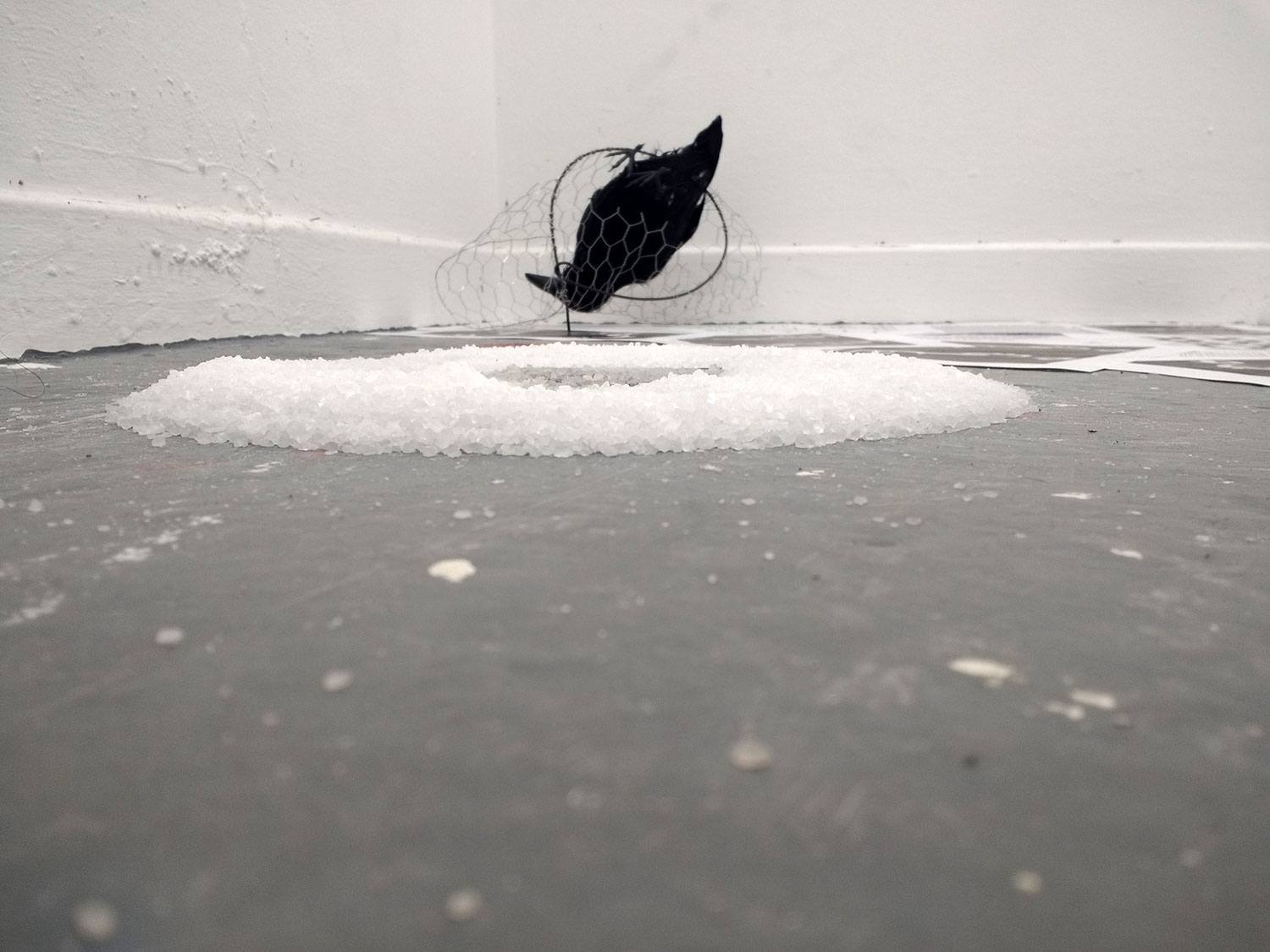 I wanted to be provocative and play around with this vision we have of the burqa, in my installation a circle of salt recalling the shape of the birdcage is placed on the ground this contains a picture of a woman wearing a burqa.